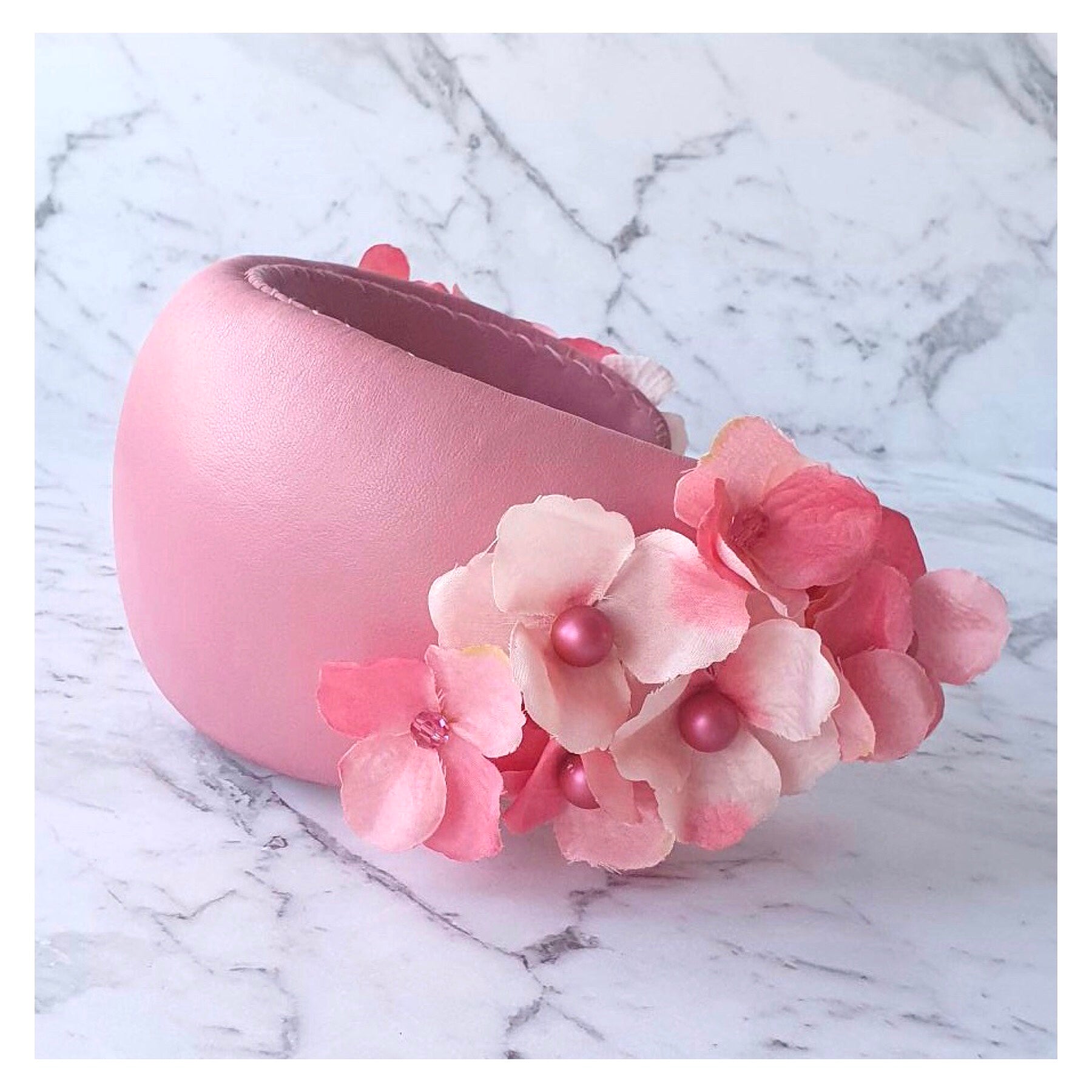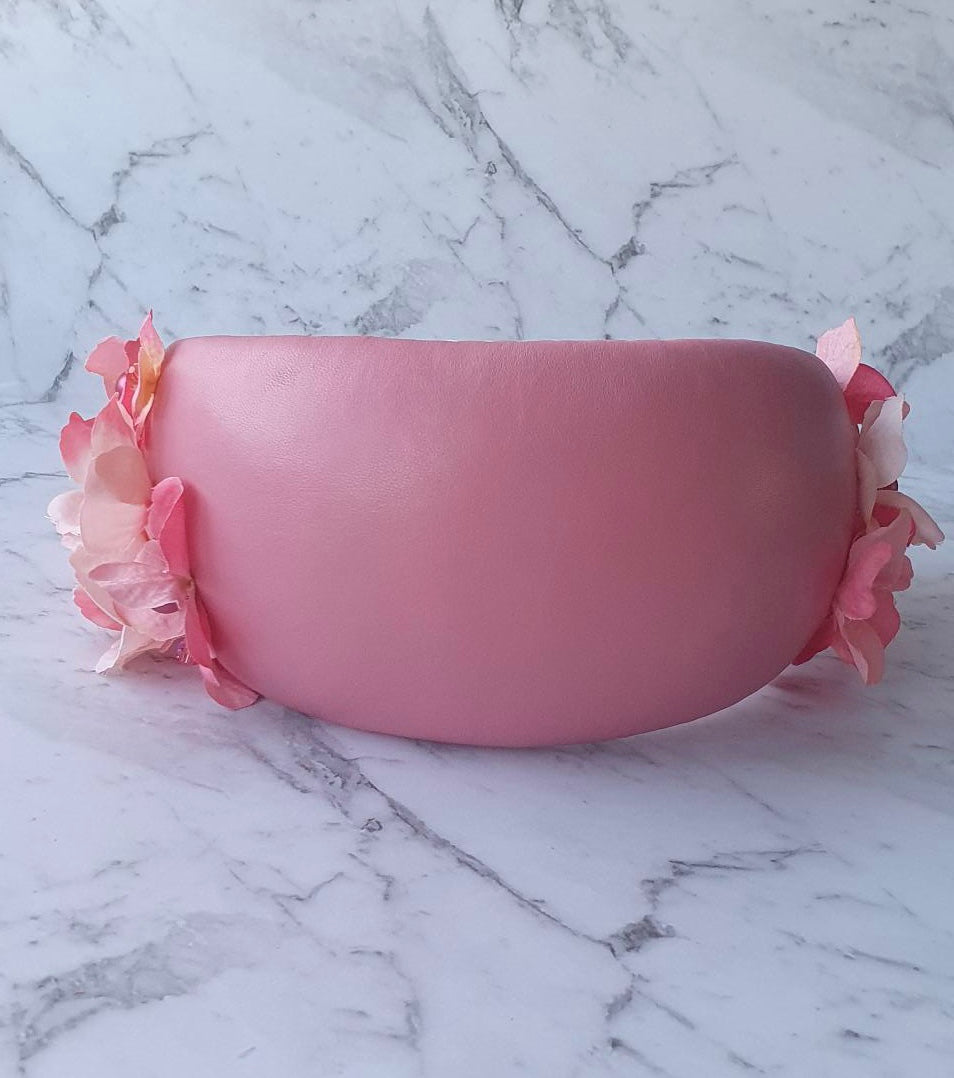 ‘Hayley’ is a beautiful spring piece, the bandeau style shape is covered with the softest pink leather, adorned with pink fabric hydrangeas and our signature Swarovski Peals and Crystals accents.